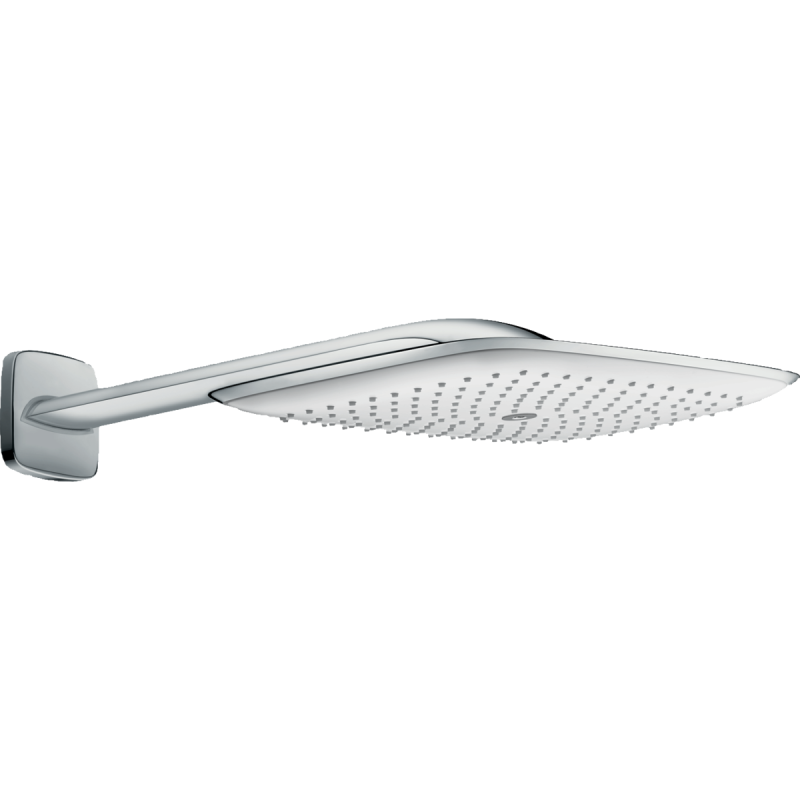 Dušo galva iš sienos su dušo alkūne, Chromo/baltos spalvos, Matmenys 390x260 mm, 390 mm dušo alkūnė, 1 srovės ("RainAir"), Maksimalus vandens srovės srautas - 21 l/min., 5 metų garantija