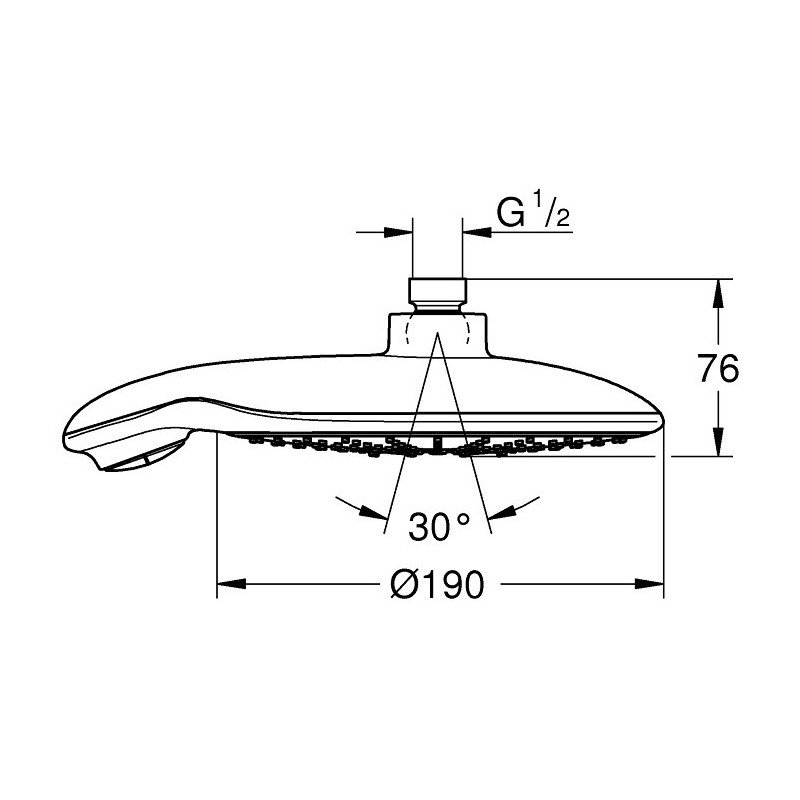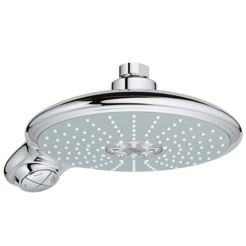 Dušo galva Grohe Power&Soul 190, Iš sienos, 4 srovių. Dušo galvutėje Grohe Power&Soul 190 (iš sienos), integruota DreamSpray technologija, kuri užtikrina itin tikslų ir nuoseklų vandens pasiskirstymą kiekviename dušo galvutės purkštuke. Dušo galvutėje yra keli vandens bėgimo variantai, todėl galėsite pasirinkti Jums labiausiai patinkantį. Apvalus sujungimas leidžia sukioti dušo galvą į abi puses po 15°.