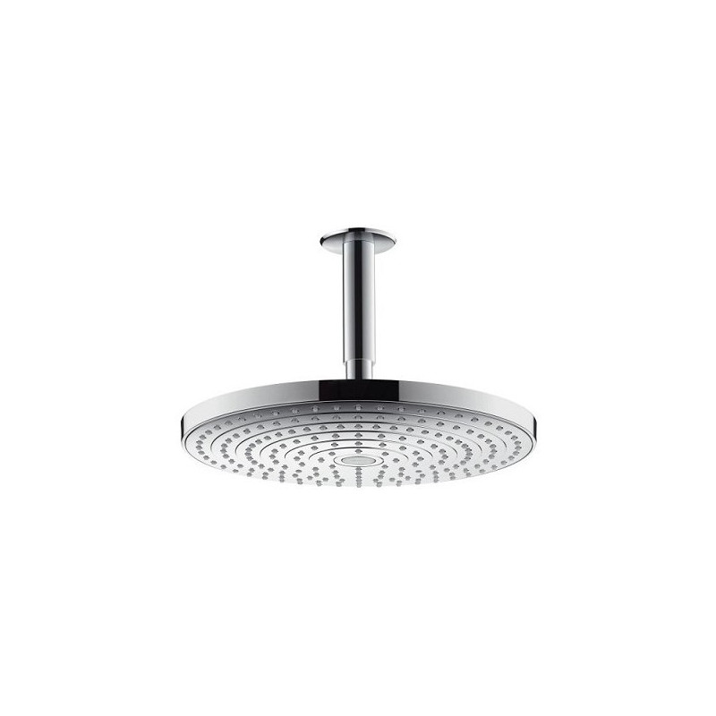 Dušo galva iš lubų Hansgrohe Raindance S 300, su 100mm dušo alkūne. Dušo galva su 2 srovės tipais ("Rain", "RainAir"), leis mėgautis dušo teikiamu komfortu. Maks. vandens srovės srautas - 17l/min. Dušo galva iš lubų Hansgrohe Raindance S 300 yra 300mm skersmens, o tai leis mėgautis plačia vandens srove, o maudymasis duše taps itin malonus. Suteikiama 5 metų garantija.