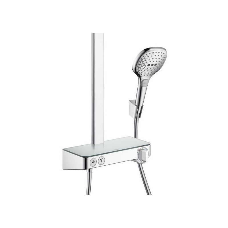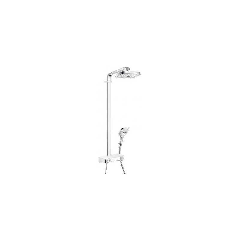 Dušo komplektas Hansgrohe Raindance E Showerpipe 300, su termostatiniu maišytuvu ShowerTablet Select 300. Į komplektą įeina: Dušo galva iš lubų (2 srovės - "Rain", "RainAir"), termostatinis maišytuvas, dušo žarna (160 cm) bei rankinis dušas su 120 mm skersmens galva ir 3 srovių tipais ("Rain", "RainAir", "WhirlAir"), kuris leis mėgautis dušo teikiamu komfortu. Dušo komplekte Hansgrohe Raindance E Showerpipe 300 su termostatiniu maišytuvu ShowerTablet Select 300, maksimalus vandens srautas 15 l/min. - rankinio dušo, 16 l/min. - dušo galvos iš lubų.
