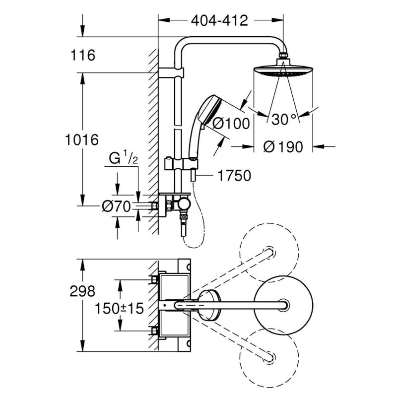 Dušo komplektas Grohe Eurotrend System 190 su termostatiniu maišytuvu. SpeedClean technologija su StarLight chromo apdaila, padės palaikyti švarą bei nesikaups kalkių nuosėdos, todėl dušo komplekto Grohe Eurotrend System 190 priežiūra taps itin lengva. Komplektą sudaro stacionari 190mm dušo galva, rankinis dušas (3 srovių), termostatinis dušo maišytuvas, Grohe EasyReach dušo lentynėlė.
