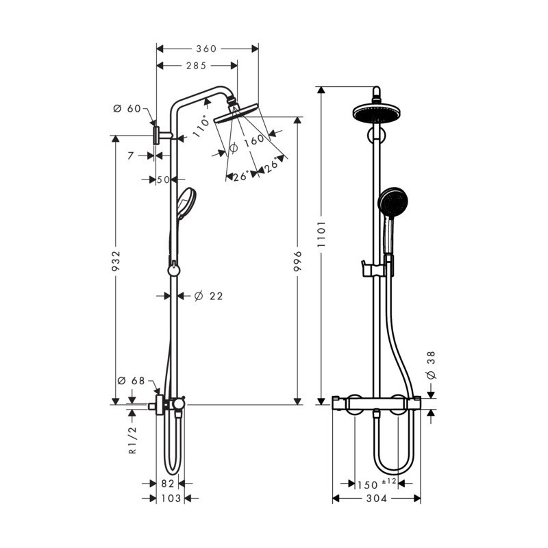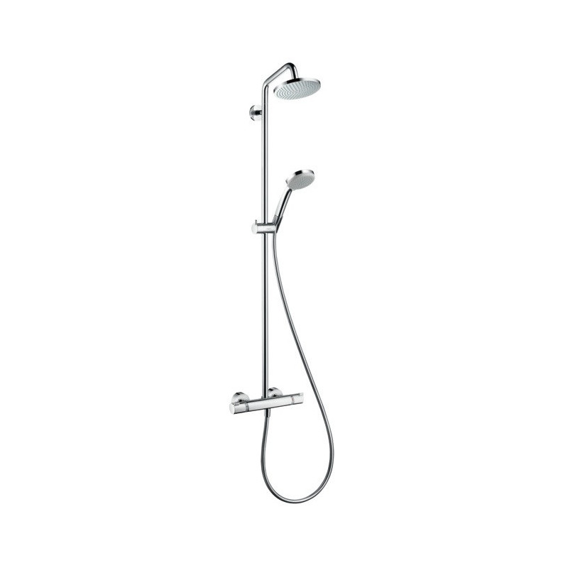 Dušo komplektas Hansgrohe Croma 160, su termostatiniu maišytuvu Ecostat Comfort. Į komplektą įeina: Dušo galva iš lubų (1 srovės - "Rain"), termostatinis maišytuvas, dušo žarna(160cm) bei rankinis dušas su 100mm skersmens galva ir 4 srovių tipais ("Rain", "Normal spray", "Shampoo spray", "Massage spray"), kuris leis mėgautis dušo teikiamu komfortu. Dušo komplekte Hansgrohe Croma 160 su termostatiniu maišytuvu Ecostat Comfort, maksimalus vandens srautas 17l/min - dušo galvoje iš lubų, 18l/min - rankinio dušo.