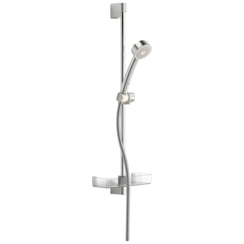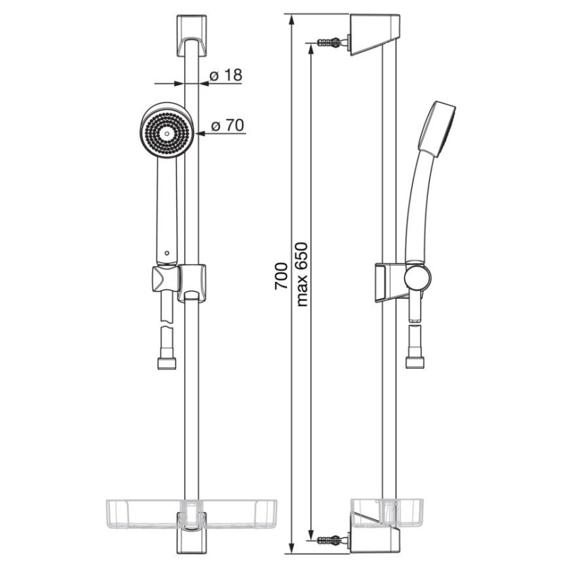 Dušo komplektas, Chromuotas, 65cm stovas, Antikalkinis rankinis dušas su laikikliu ir 70mm dušo galva, 150cm dušo žarna, Maks. vandens srovės srautas 18l/min, 1 srovės, Su muilo lentynėle