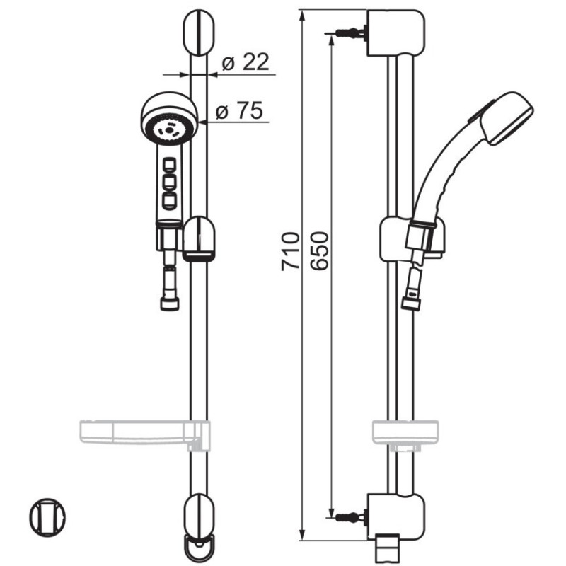 Dušo komplektas, Chromuotas, 65cm stovas, Antikalkinis masažinis rankinis dušas su laikikliu ir 75mm dušo galva, Dušo žarna, Su muilo lentynėle