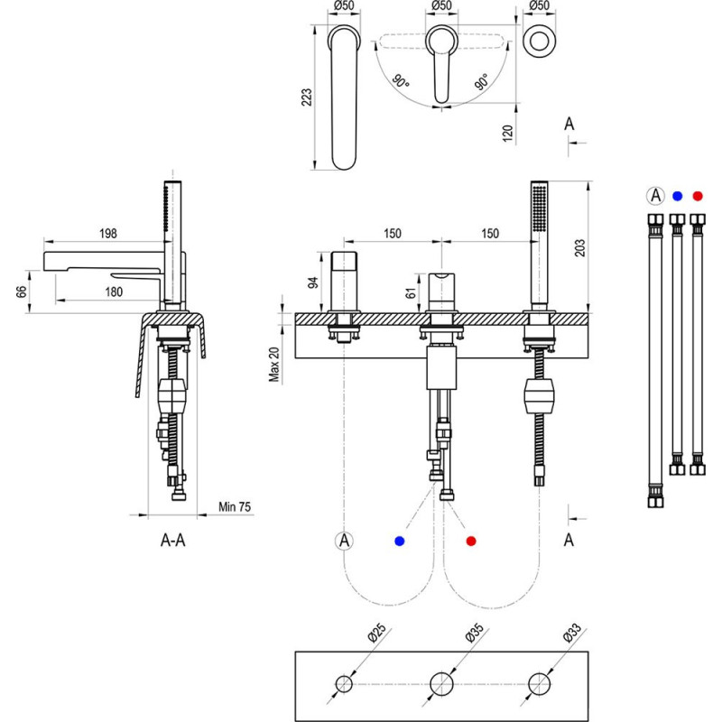 - 3 dalių: čiaupas, rankinis dušas, svirtis valdymui