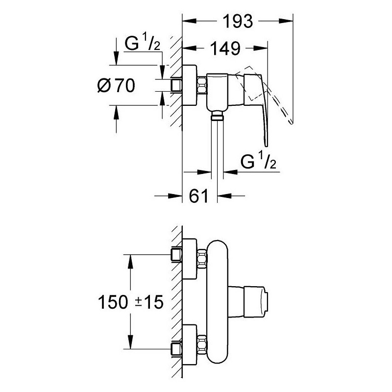 Dušo maišytuvas, Chromuotas, Montuojamas prie sienos, Metalinė svirtis, Reguliuojama vandens srovė