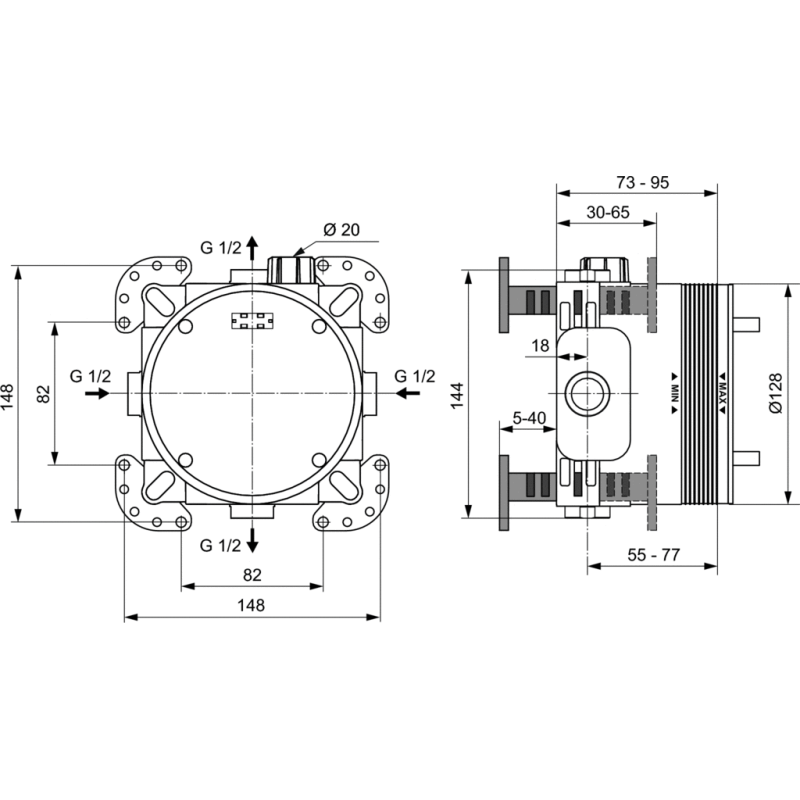 Potinkinė dalis Ideal Standard Easy-Box Kit 1 vonios arba dušo maišytuvui su universaliu pajungimu - G 1/2" x G 1/2". Suteikiama 2 metų garantija.