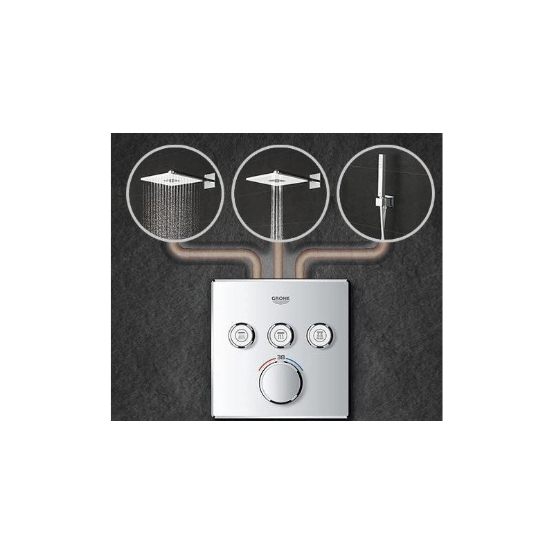 Potinkinis dušo maišytuvas Grohe Grohtherm SmartControl, chromo spalvos, be potinkinės dalies, su 3 vožtuvais. Potinkinio maišytuvo Grohe Grohtherm SmartControl "StarLight" apdaila padeda lengvai jį prižiūrėti, todėl nereikia didelių pastangų jį valant. SafeStop funkcija vonios maišytuve Grohe Grohtherm SmartControl leidžia nustatyti maksimalią 38 °C vandens temperatūrą, o TurboStat technologija padės palaikyti tą pačią temperatūrą, todėl maudymasis vonioje taps dar malonesnis ir komfortiškesnis. Integruota viena metalinė valdymo svirtis vandens srovės srauto ir temperatūros reguliavimui. Integruoti trys vožtuvai leis pasirinkti tarp lietaus (2 srovių) ir rankinio dušo, arba visų vienu metu. Paprastas ir greitas montavimas (FastFixation technologija). Tinka montavimui su Grohe 35600/35604 potinkine dalimi. Suteikiama 5 metų garantija.