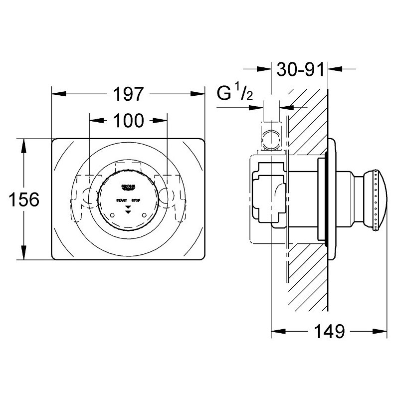 Potinkinis dušo maišytuvas, Be potinkinės dalies, Su srovės laiko ribotuvu, Chromo spalvos, EcoJoy technologija, Reguliuojamas srovės laikas nuo 5 iki 40 s, Tinka su Grohe 36122 potinkine dalimi, Temperatūros ribotuvas, 5 metų garantija