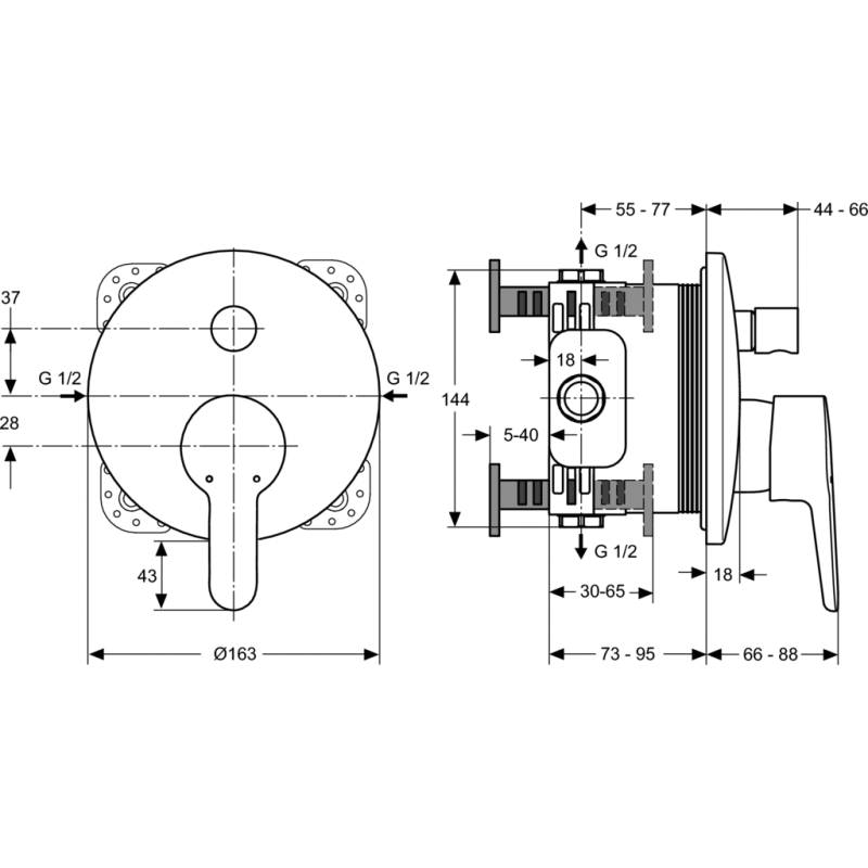 Potinkinis dušo maišytuvas, Be potinkinės dalies, Chromuotas, Temperatūros ribotuvas, Žalvarinis, Metalinė svirtelė vandens temperatūros ir srovės stiprumo reguliavimui, Automatinis perjungėjas, 47 mm keramikinė kasetė, 5 metų garantija