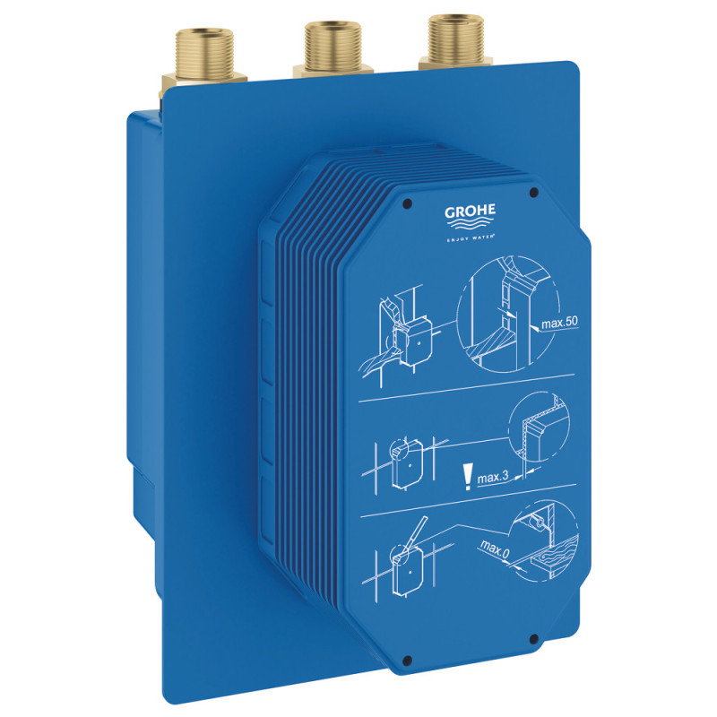 Potinkinė dalis Grohe Eurosmart Cosmopolitan T. Potinkinė dalis montuojama sienoje, yra du sustabdymo vožtuvai. Prie potinkinės dalies reikia prisikomplektuoti dekoratyvinę dušo maišytuvo dalį Grohe Eurosmart Cosmopolitan T (perkama atskirai). Suteikiama 5 metų garantija.