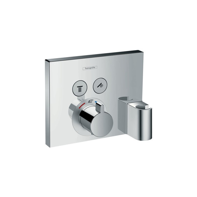 Dekoratyvinė dalis termostatiniam potinkiniam dušo maišytuvui Hansgrohe Shower Select, 2 funkcijų, su laikikliu. Dušo dekoratyvinės dalies Hansgrohe Shower Select chromo apdaila padeda lengvai jį prižiūrėti, todėl nereikia didelių pastangų jį valant. Dekoratyvinė dalis tinka su daugeliu potinkinių maišytuvų (perkamas atskirai). 2 funkcijų dekoratyvinė dalis leidžia mėgautis vandens srove iš dviejų išėjimų (pvz: rankinio dušo ir lietaus dušo galvos). Mygtuko paspaudimu galima reguliuoti iš kur paduoti vandens srovę, ar ją visai sustabdyti. Integruotas laikiklis rankiniam dušui. Suteikiama 5 metų garantija.