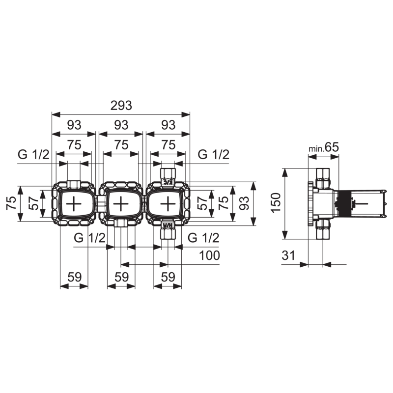 Termostatinio vonios ir dušo maišytuvo korpusas, Montuojamas sienoje, Dviejų išėjimų, Maks. vandens temperatūra +70°C