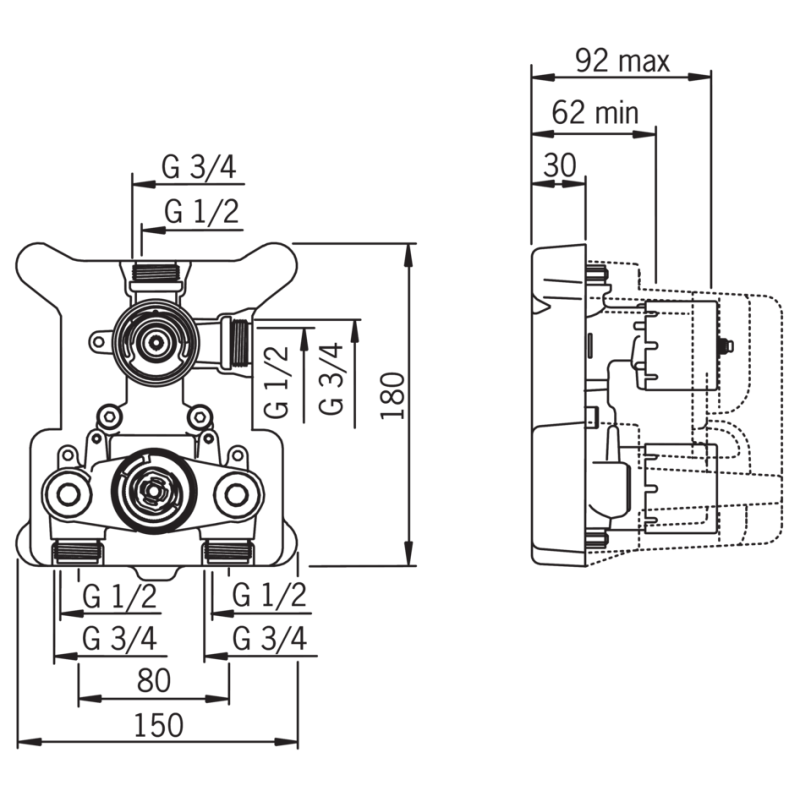 Termostatinio vonios ir dušo maišytuvo korpusas, Montuojamas sienoje, Naudojama kartu su dekoratyvinėmis dalimis Oras 8578, 8688, 2888, 7188, Maks. vandens temperatūra +80°C, Karštas vanduo jungiamas kairėje pusėje, Maks. vandens srovės srautas - 19.8l/mi