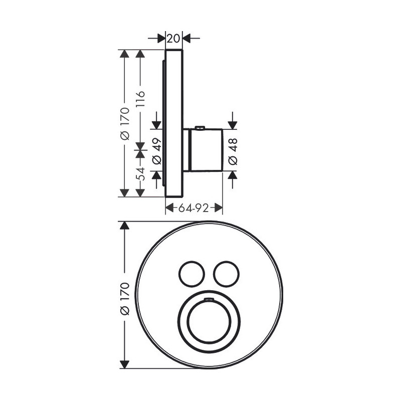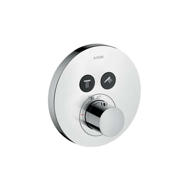 Dekoratyvinė dalis potinkiniam termostatiniam maišytuvui Hansgrohe AXOR ShowerSelect Round. Galimybė pasirinkti iš dviejų vandens srautų mygtukais: 23 ir 25 l/min. Reguliuojama maksimali temperatūra, o saugumui užtikrinti yra funkcija, kuri neleidžia vandens temperatūrai pakilti daugiau nei 40°C, todėl maudydamiesi nenusiplikysite. Yra mygtukai, kurie leis patogiai pasirinkti reikiamą vandens srauto tipą. Suteikiama 5 metų garantija.