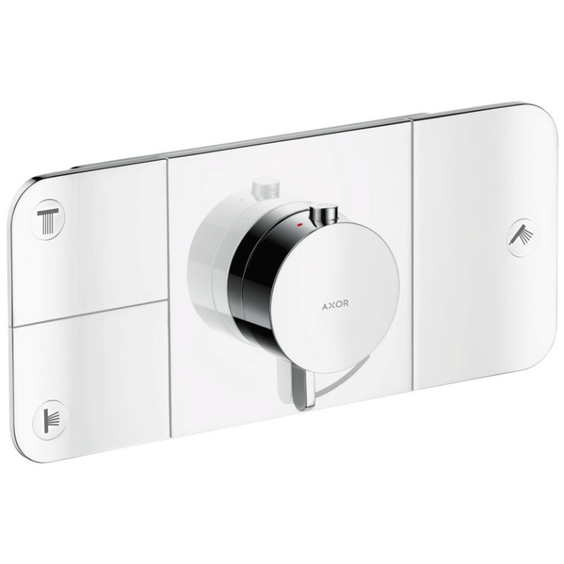 Potinkinė dalis termostatiniam dušo maišytuvui Hansgrohe Axor One, 3 taškams. Integruota Eko funkcija, kuri rankenėlės pagalba leidžia sumažinti vandens srautą. Patogūs mygtukai vandens srovės tipo pasirinkimui. Maks. vandens srautas naudojant 1 tašką - 24 l/min., naudojant 3 taškus vienu metu - 30 l/min. Galimybė apriboti temperatūrą ties 40°C, taip apsaugant nuo nusiplikymo maudantis. Suteikiama 5 metų garantija.