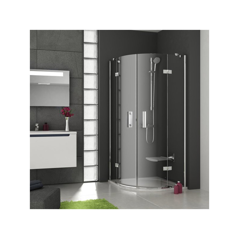 Ravak SmartLine SMSKK4-90 keturių elementų pusapvalė dušo kabina su varstomomis durimis susideda iš dviejų plokščių nejudančių elementų ir dviejų judančių lenktų dalių, sudarančių varstomas pasukamojo tipo duris. Dvigubos durys vonios kambaryje užima mažai vietos, o metalinė rankena sukuria didesnį komfortą varstant duris.