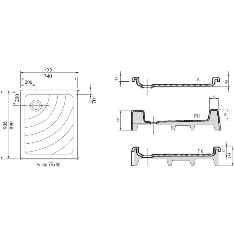 Ravak Kaskada Aneta stačiakampiai dušo padėklai iš akrilo tinka 75 x 90 cm dydžio dušo erdvėms, kuriose sumontuotos Ravak dušo durys ASDP3, SDZ3, SDOP,SRV2 S, PDOP1.