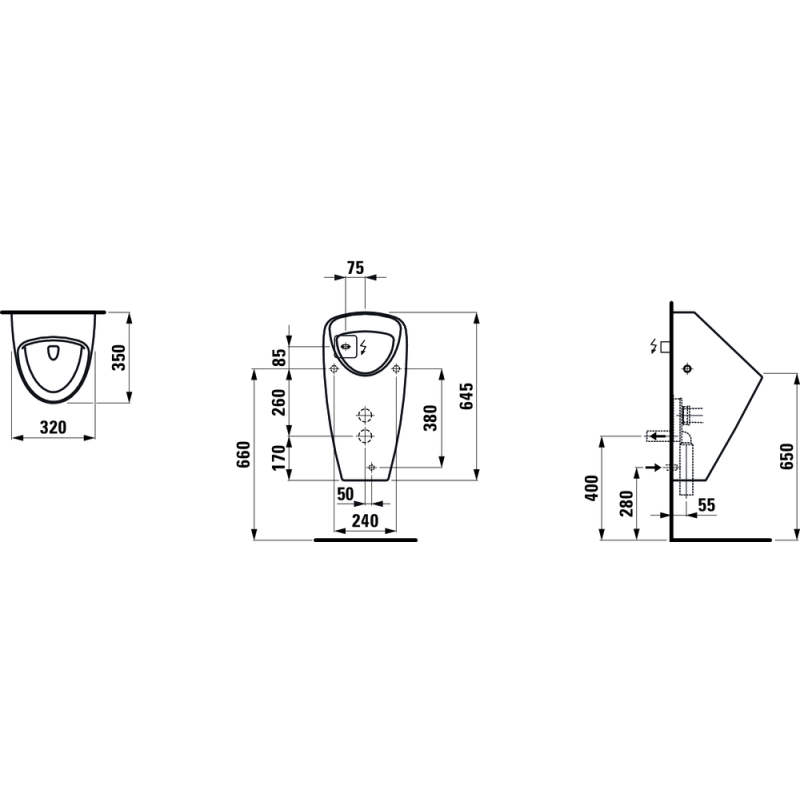 Pisuaras su paslėptu pajungimu, Su elektronine valdymo sistema, 6 V (maitinimas nuo baterijos), Antivandalinis, Baltos spalvos, Su montavimo rinkiniu ir 50 mm pajungimo vamzdžiu, Matmenys (PxAxG) - 320x645x350 mm, 5 metų garantija