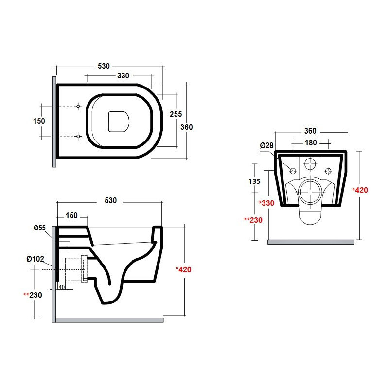 Pakabinamas unitazas, Baltos spalvos, Aukštos kokybės keramika, Matmenys (PxAxG) - 360x420x530 mm, 10 metų garantija