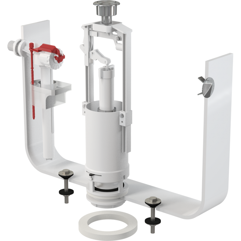 Pripildymo mechanizmų komplektas, Į komplektą įeina nuleidimo ir šoninio pripildymo mechanizmai Alca Plast, Chromuotas mygtukas, Baltos spalvos mechanizmai, 3 metų garantija