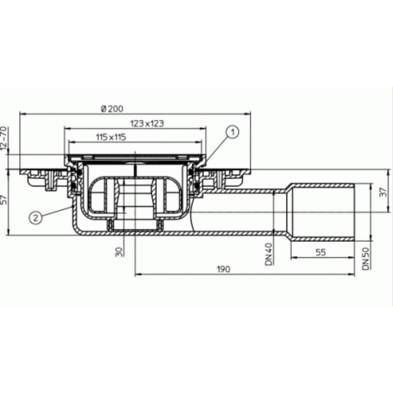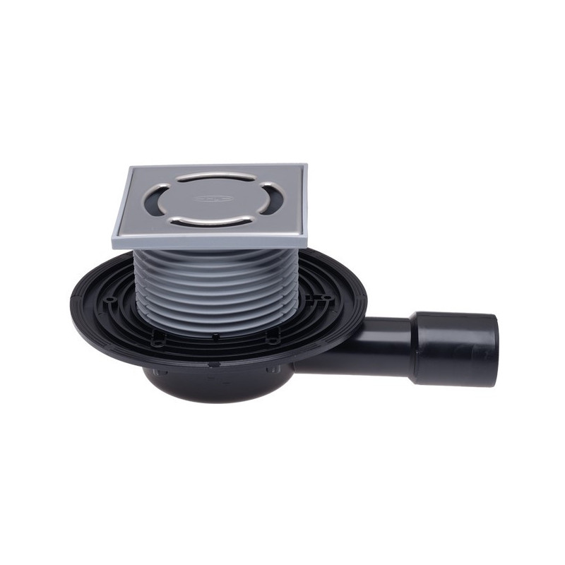 Trapas su sifonu HL Primus, Horizontalus išbėgimas, Trapo pajungimas - DN40/50, Su nerūdijančio plieno grotelėmis (115x115 mm), Visas aukštis - 57 mm, 2 metų garantija