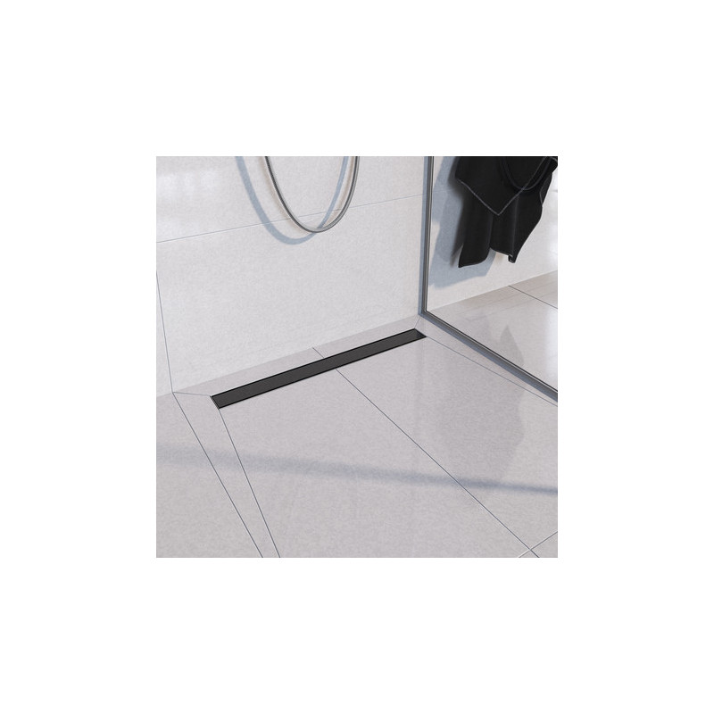 Dušo latakas, Su nerūdijančio plieno grotelėmis (juodo grūdinto stiklo), Ilgis - 500 mm, Šoninis horizontalus pajungimas - DN50, Vandens pratekamumas - 56 l/min., Reguliuojamos kojelės, 25 metų garantija
