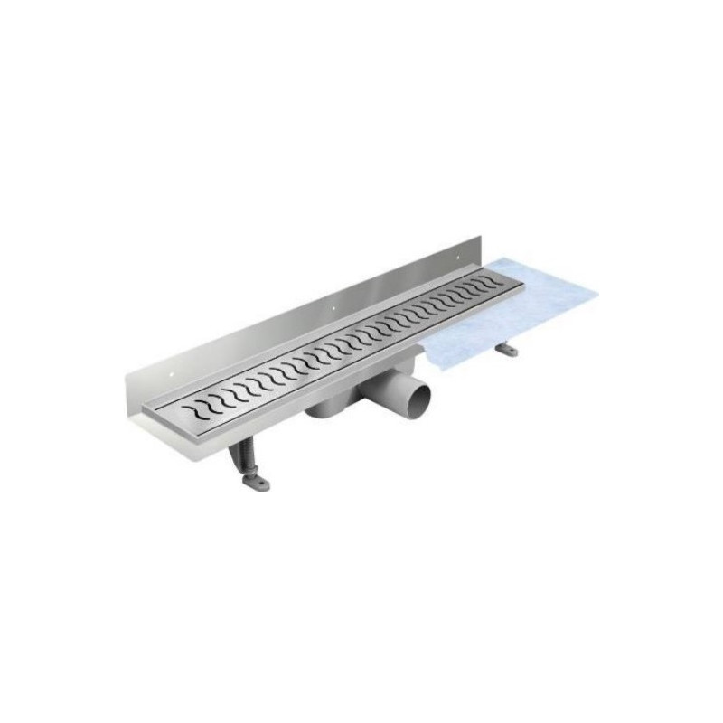 Dušo latakas, Su nerūdijančio plieno grotelėmis (bangos raštas), Sieninis, Ilgis - 500 mm, Šoninis horizontalus pajungimas - DN50, Vandens pratekamumas - 56 l/min., Reguliuojamos kojelės, 25 metų garantija