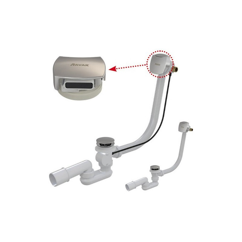 Vonios sifonas Ravak II 800, su chromuotu metaliniu dangteliu, su persipylimu. Sifonas tinkamas montavimui su visų tipų Ravak II 800 voniomis. Troseliu valdomas mechanizmas - pasukus valdymo ratuką uždaromas arba atidaromas išleidimo dangtelis. Ravak II 800 sifonai yra su kvapų užtvara. Suteikiama 3 metų garantija.