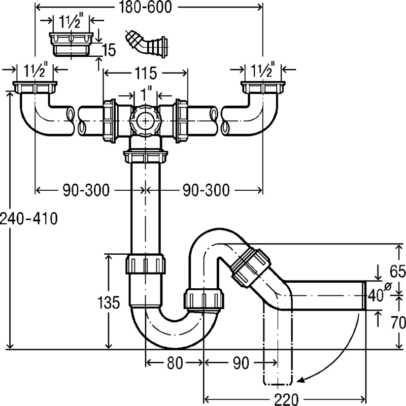 Sifonas dvigubai plautuvei, Reguliuojamas aukštis, Be ventilio, 45°, DN 40, G 1 1/2", Plastikinis, Baltos spalvos, Su pajungmu skalbimo mašinai, 2 metų garantija