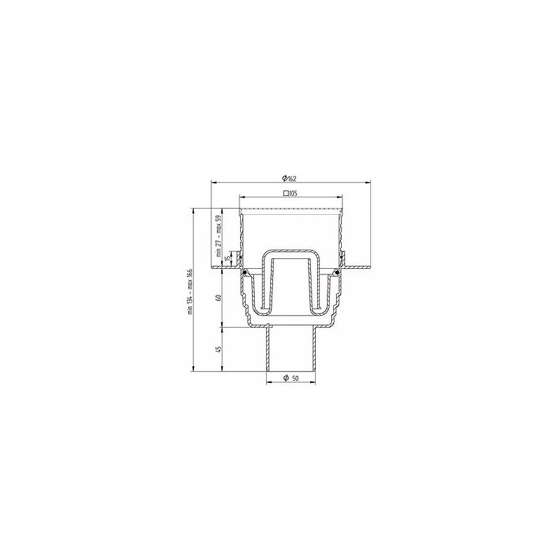 Dušo trapas Vogi, Horizontalus dvigubas, Šlapias sifonas, Su nerūdijančio plieno grotelėmis (105x105 mm), Šoninis horizontalus pajungimas - DN50, Vandens pratekamumas - 50 l/min.