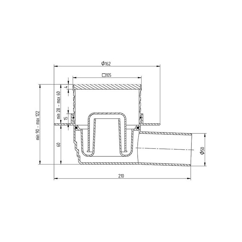 Dušo trapas Vogi Evo, Horizontalus, Šlapias sifonas, Su membrana, Su nerūdijančio plieno grotelėmis DESIGN 4mm (105x105 mm), Šoninis horizontalus pajungimas - DN50, Vandens pratekamumas - 50 l/min.