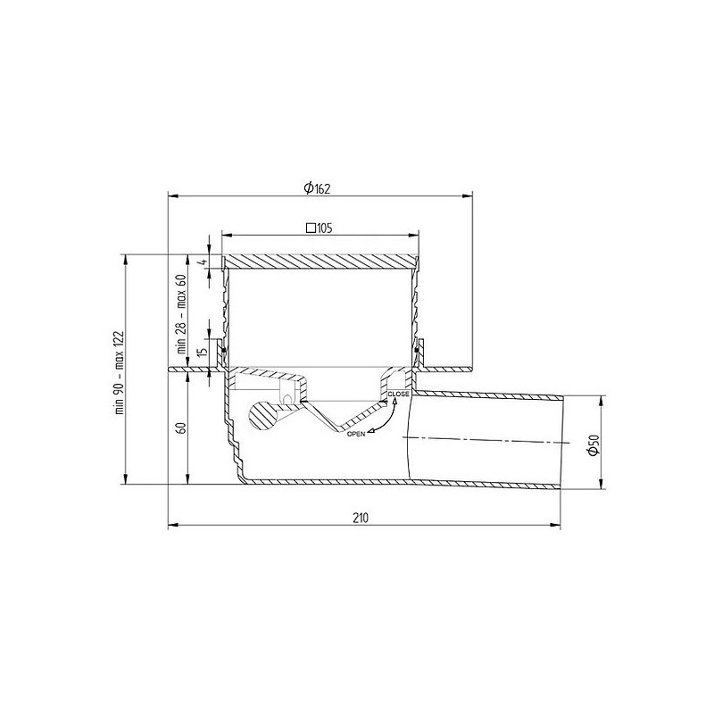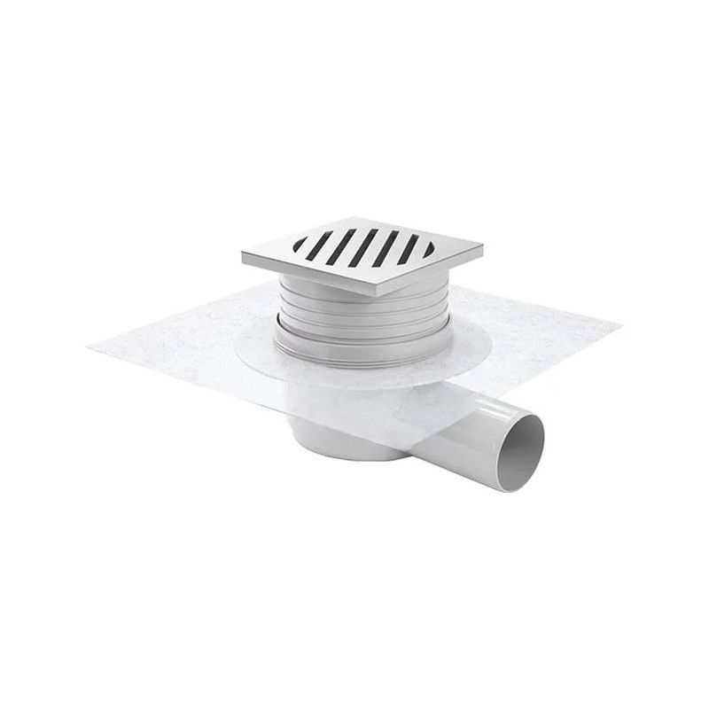 Dušo trapas Vogi Evo, Horizontalus, Sausas sifonas, Su membrana, Su nerūdijančio plieno grotelėmis DESIGN 4mm (105x105 mm), Šoninis horizontalus pajungimas - DN50, Vandens pratekamumas - 50 l/min.
