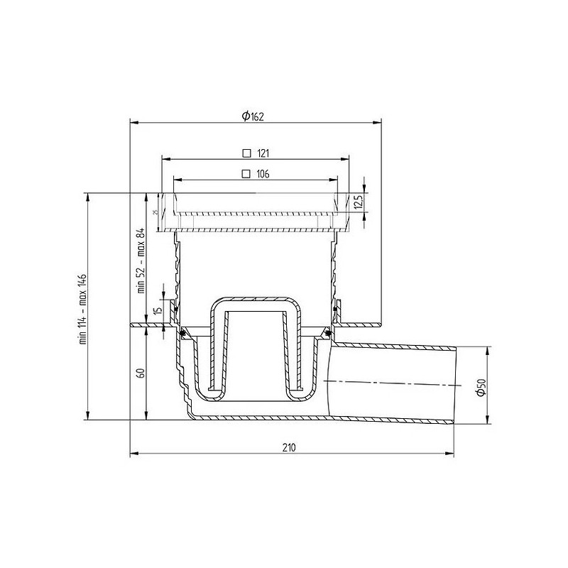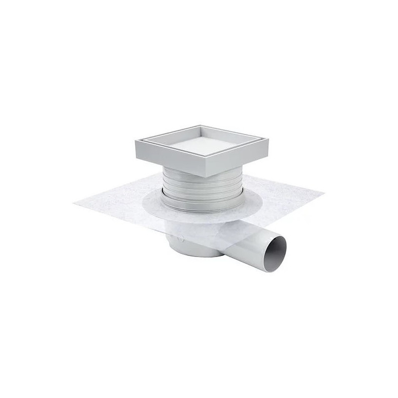 Dušo trapas Vogi Evo, Horizontalus, Šlapias sifonas, Su membrana, Su įklijuojama plytele (105x105 mm), Šoninis horizontalus pajungimas - DN50, Vandens pratekamumas - 50 l/min.