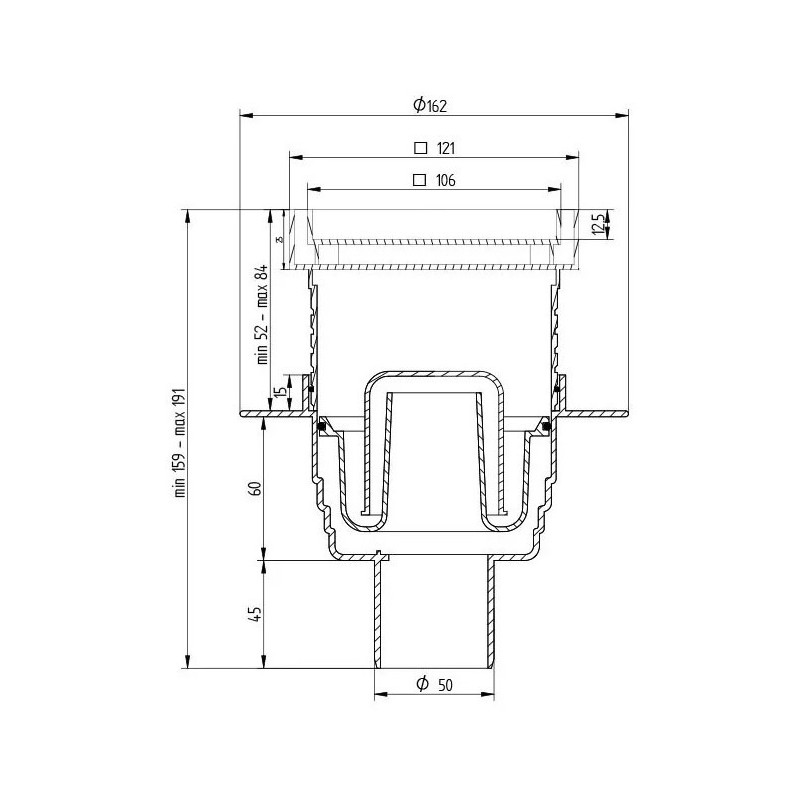 Dušo trapas Vogi Evo, Vertikalus, Šlapias sifonas, Su membrana, Su įklijuojama plytele (105x105 mm), Vertikalus pajungimas - DN50, Vandens pratekamumas - 50 l/min.