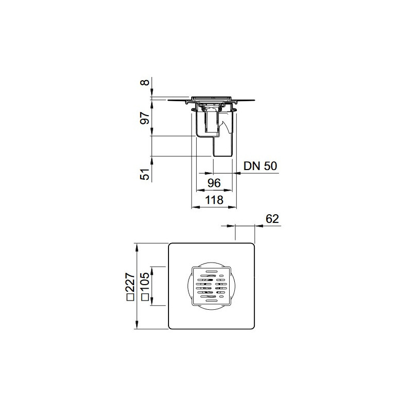 Dušo trapas, Matmenys 105x105 mm, Vertikalus, Su nerūdijančio plieno grotelėmis (95x95 mm), Pajungimas - DN50, 2 metų garantija