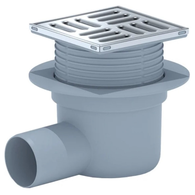 Grindų trapas, Sausas, Matmenys 100x100 mm, Pajungimas - DN50, Horizontalus, Reguliuojamas aukštis (8 - 45 mm), Su nerūdijančio plieno grotelėmis ir rėmeliu, Maks. apkrova - 300 kg, 10 metų garantija