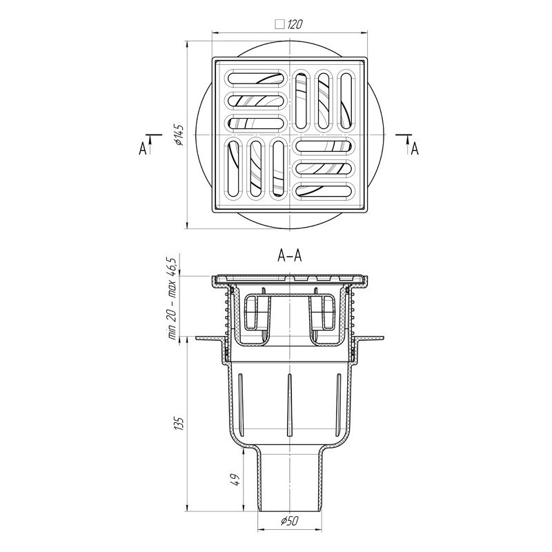 Grindų trapas Ani Plast TQ5714, 120x120 mm, su nerūdijančio plieno grotelėmis ir rėmeliu, sausas. Trapas yra su vertikaliu ištekėjimu (DN50), reguliuojamu aukščiu (9.5 - 46.5 mm). Maksimali trapo apkrova - 300 kg. Suteikiama 10 metų garantija.