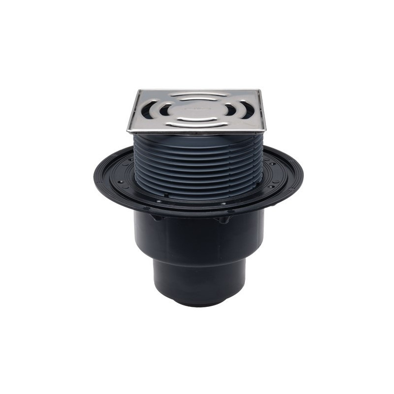 Trapas su sifonu HL Primus, Vertikalus išbėgimas, Išbėgimas - DN50/75/110, Su nerūdijančio plieno grotelėmis (138x138 mm), Vandens pratekamumas siekia - 48 l/min., Visas aukštis - 170 mm, 2 metų garantija