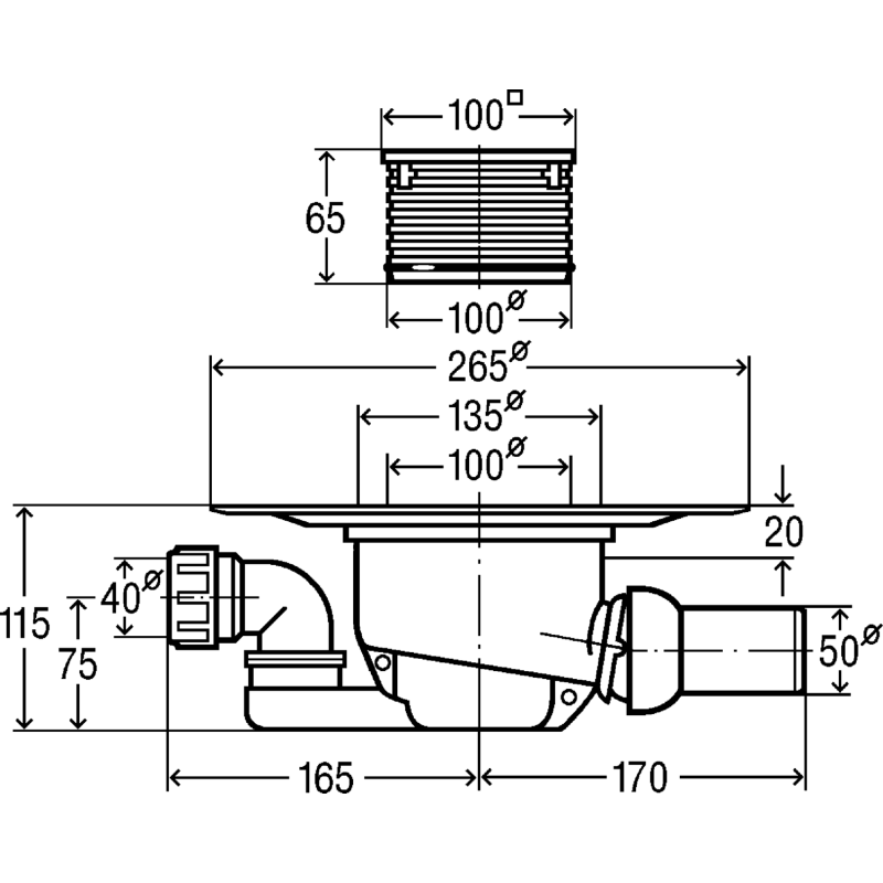 Trapas, DN 50, Matmenys - 100x100 mm, Reguliuojamas aukštis, Rėmas iš plastiko, Su nerūdijančio plieno grotelėmis, Nuimama kvapų gaudyklė, 2 metų garantija