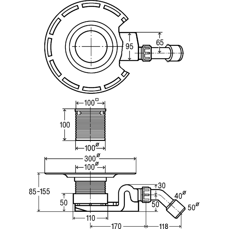 Trapas, DN 40/50, Matmenys - 100x100 mm, Su sifonu, Reguliuojamas aukštis, Rėmas iš plastiko, Su nerūdijančio plieno grotelėmis, Maks. apkrova - 300 kg, 2 metų garantija