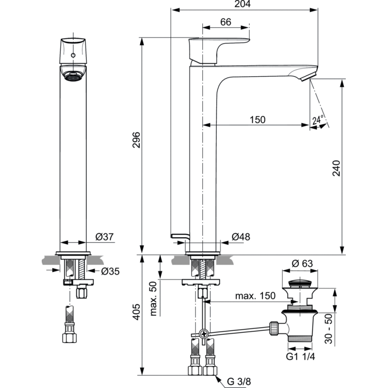 - Vandens pajungimas - G 3/8" (lankstūs vamzdeliai)