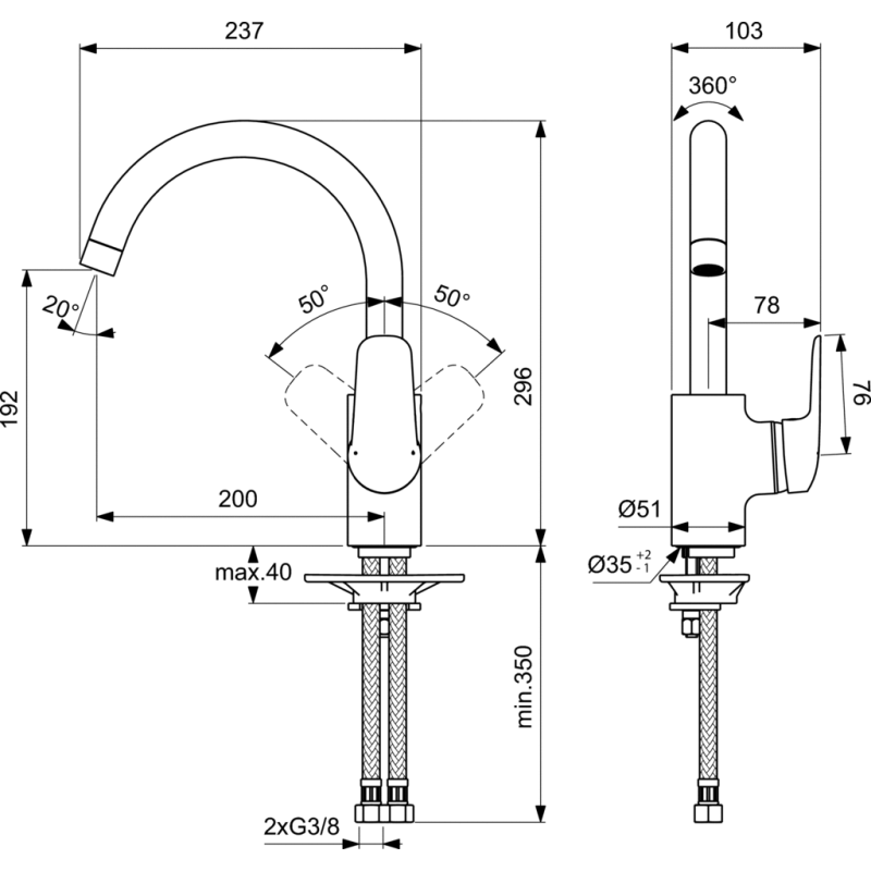 | Maišytuvo valdymo tipas | Iš šono |