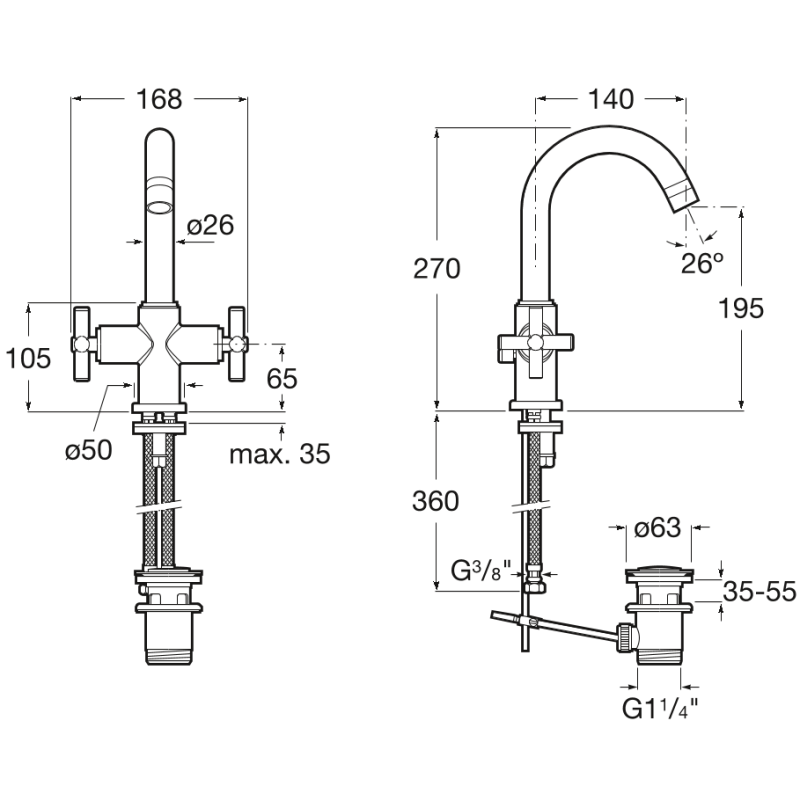 Praustuvo maišytuvas, Chromo spalvos, Valdymo rankenėlės iš šonų, Su dugno vožtuvu, Vandens pajungimas - G 3/8" (lankstūs vamzdeliai), Visas aukštis - 270mm, 5 metų garantija