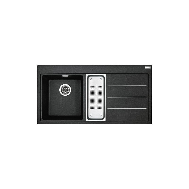 Granitinė plautuvė Franke Mythos Fusion MTF 651-100, dubuo kairėje, su ventiliu ir indu. Dubenų matmenys - 360x390x200/160x390x153mm. Plautuvė stačiakampio formos, juodos spalvos, modernaus dizaino, todėl tiks prie įvairaus virtuvės interjero. Plautuvė Franke Mythos Fusion MTF 651-100, su nusausinimo plokštuma, montuojama ant stalviršio, taip pat integruotas platus 3.1/2" ekscentrinis ventilis. Suteikiama 2 metų garantija.