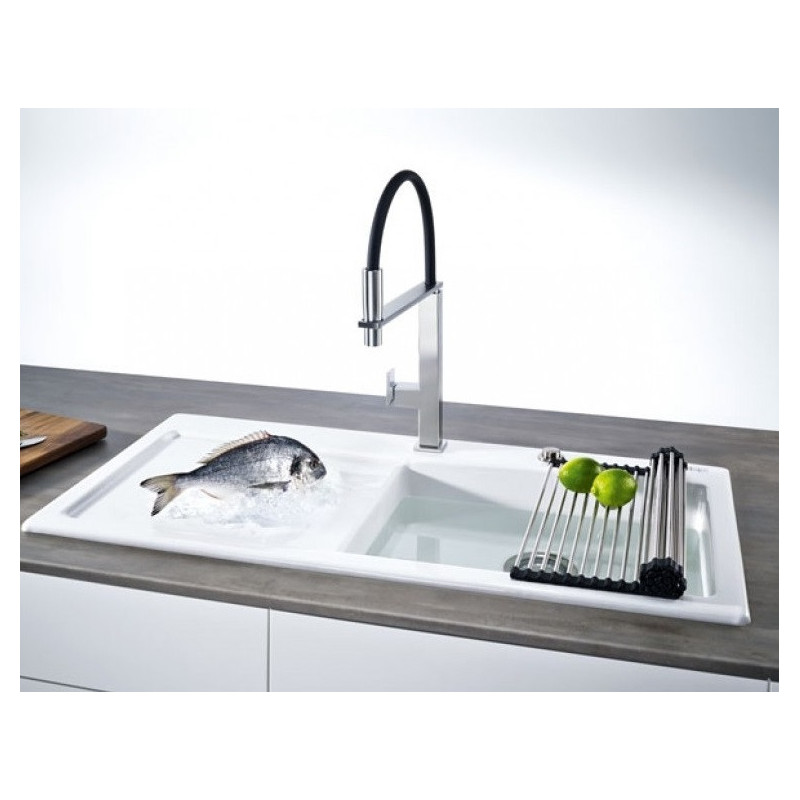 Keramikinė plautuvė Franke Mythos MTK611-100, dubuo dešinėje, su ventiliu. Dubens matmenys - 492x372 mm. Plautuvė stačiakampio formos, baltos spalvos, modernaus dizaino, todėl tiks prie įvairaus virtuvės interjero. Plautuvė Franke Mythos MTK611-100, su nusausinimo plokštuma, montuojama ant stalviršio, taip pat integruotas platus 3.1/2" ekscentrinis ventilis. Suteikiama 2 metų garantija.