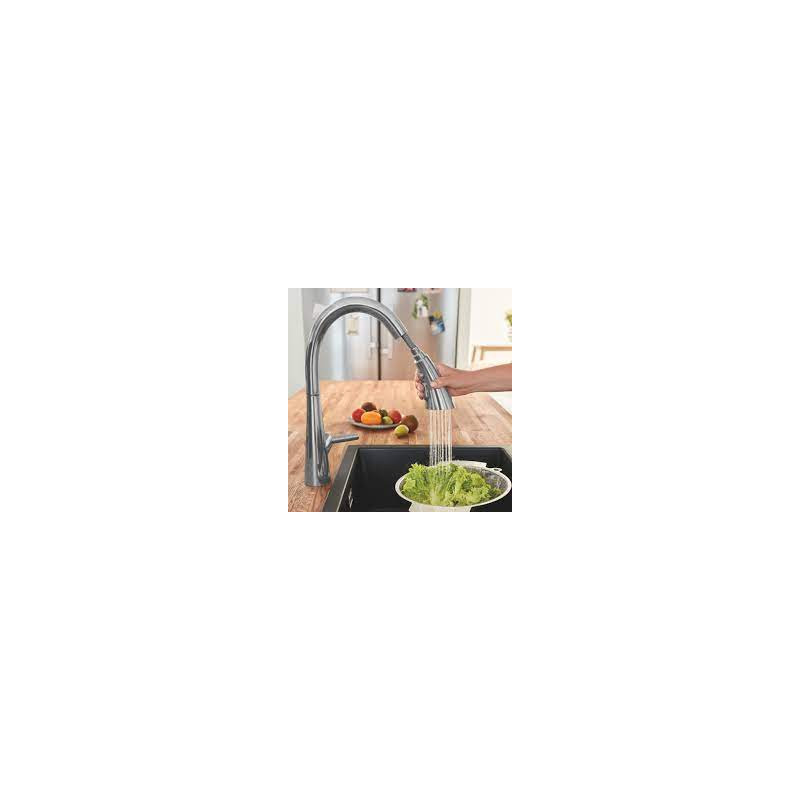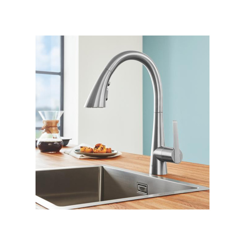 Plautuvės maišytuvas Grohe Zedra, plieno spalvos, su ištraukiama žarna, aukštas. Plautuvės maišytuvo StarLight apdaila padeda lengvai jį prižiūrėti, todėl nereikia didelių pastangų jį valant. Maišytuvo valymui naudojamas tik vanduo ir muilas, kad jo paviršius liktų nepažeistas. Maišytuvas sukasi 360° kampu, valdomas su rankenėle iš šono. Elegantiškas Grohe Zedra maišytuvo dizainas, derinasi prie įvairaus virtuvės interjero, todėl tai puikus pasirinkimas, norintiems išskirtinio plautuvės maišytuvo. Maišytuvas su ištraukiama žarna su magnetiniu galvutės pajungimu, todėl galvutė lengvai nuimama ir sklandžiai jungiama dedant ją atgal į pradinę padėtį. Galimybė rinktis iš 3 tipų vandens srauto. Vandens pajungimas - G 3/8". Maišytuve naudojama keraminė kasetė užtikrina sklandų ir ilgaamžį maišytuvo veikimą. Suteikiama 5 metų garantija.
