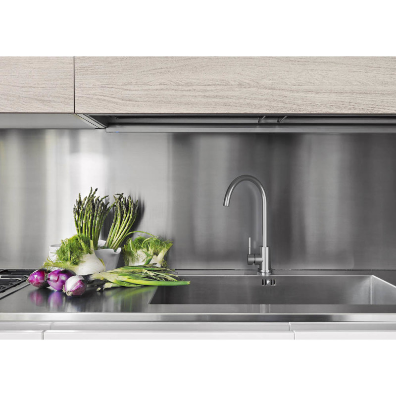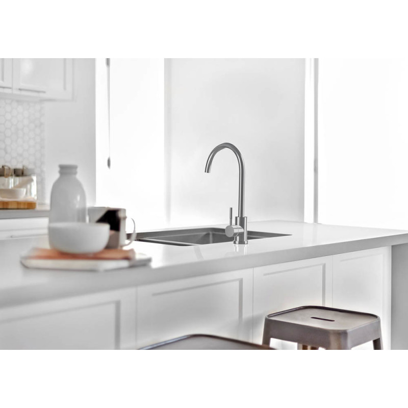 Plautuvės maišytuvas Slovarm ES.3508.AE, chromo spalvos, pagamintas iš nerūdijančio plieno, aukštu snapu. Plautuvės maišytuvo apdaila padeda lengvai jį prižiūrėti, todėl nereikia didelių pastangų jį valant. Maišytuvo valymui naudojamas tik vanduo ir muilas, kad jo paviršius liktų nepažeistas. Maišytuvas su sukiojamu aukštu snapu, valdomas su rankenėle per vidurį. Slovarm ES.3508.AE maišytuvo dizainas, derinasi prie įvairaus virtuvės interjero, todėl tai puikus pasirinkimas, norintiems klasikinio plautuvės maišytuvo. Vandens pajungimas - G 3/8". Maišytuve naudojama keraminė kasetė, kuri užtikrina sklandų ir ilgaamžį maišytuvo veikimą. Suteikiama 2 metų garantija.