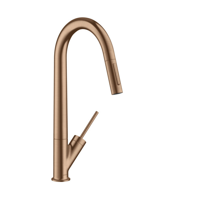 Plautuvės maišytuvas Hansgrohe Axor Starck 270, 2 spalvų kombinacija - poliruoto juodo chromo (apačioje) ir poliruoto raudono aukso (kylant į viršų), aukštu snapu, ištraukiama žarna. Plautuvės maišytuvo apdaila padeda lengvai jį prižiūrėti, todėl nereikia didelių pastangų jį valant. Maišytuvo valymui naudojamas tik vanduo ir muilas, kad jo paviršius liktų nepažeistas. Maišytuvas sukasi 110°/150° kampu, valdomas su rankenėle šone, su ištraukiama žarna lengvesniam indų plovimui. Hansgrohe Axor Starck 270 maišytuvo dizainas, derinasi prie įvairaus virtuvės interjero, todėl tai puikus pasirinkimas, norintiems išskirtinio plautuvės maišytuvo. "QuickClean" technologija palengvina maišytuvo priežiūrą, nes ant jo nesikaupia kalkių nuosėdos. Integruotas maksimalios temperatūros ribotuvas ir apsauga nuo atgalinio srauto. Taip pat yra galimybė valdyti vandens srauto kryptį 18° kampu. Vandens pajungimas - G 3/8". Maišytuve naudojama "Joystick" keraminė kasetė užtikrina sklandų ir ilgaamžį maišytuvo veikimą. Suteikiama 5 metų garantija.