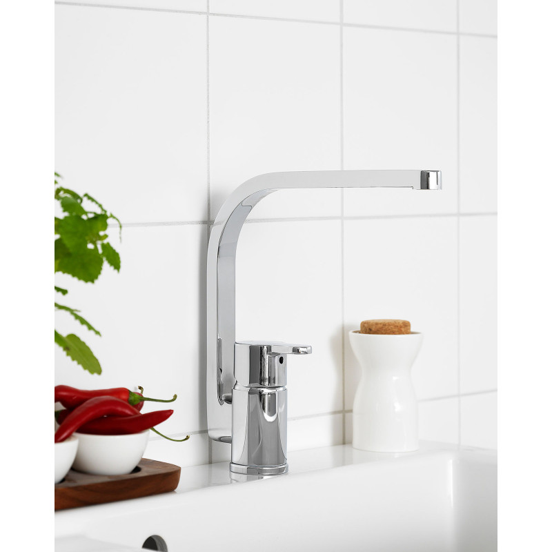 Plautuvės maišytuvas Gustavsberg Nordic 3, chromo spalvos. Plautuvės maišytuvo apdaila padeda lengvai jį prižiūrėti, todėl nereikia didelių pastangų jį valant. Maišytuvo valymui naudojamas tik vanduo ir muilas, kad jo paviršius liktų nepažeistas. Maišytuvas sukasi 110°/60° kampu, valdomas su rankenėle per vidurį, o srovė reguliuojama. Reguliuojama maksimalios temperatūros funkcija, apsauganti nuo nusideginimo ir kalkių kaupimosi. Gustavsberg Nordic 3 maišytuvo dizainas, derinasi prie įvairaus virtuvės interjero, todėl tai puikus pasirinkimas, norintiems išskirtinio plautuvės maišytuvo. Vandens pajungimas - G 3/8". Maišytuve naudojama keraminė kasetė užtikrina sklandų ir ilgaamžį maišytuvo veikimą. Suteikiama 5 metų garantija.